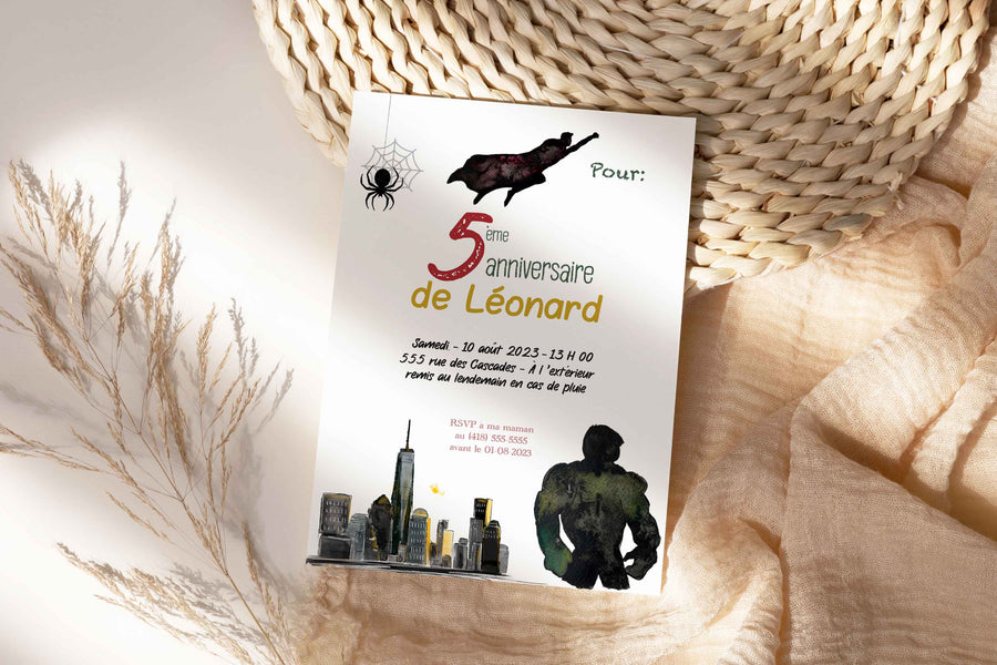NOTE IMPORTANTE: Aucun produit ne sera envoyé par la poste, vous recevrez un fichier numérique seulement. Assurez-vous d'ajouter dans les notes de la commande les renseignements à inscrire sur le carton et votre adresse courriel pour recevoir votre invitation à imprimer. 🦸♂️🎈✨