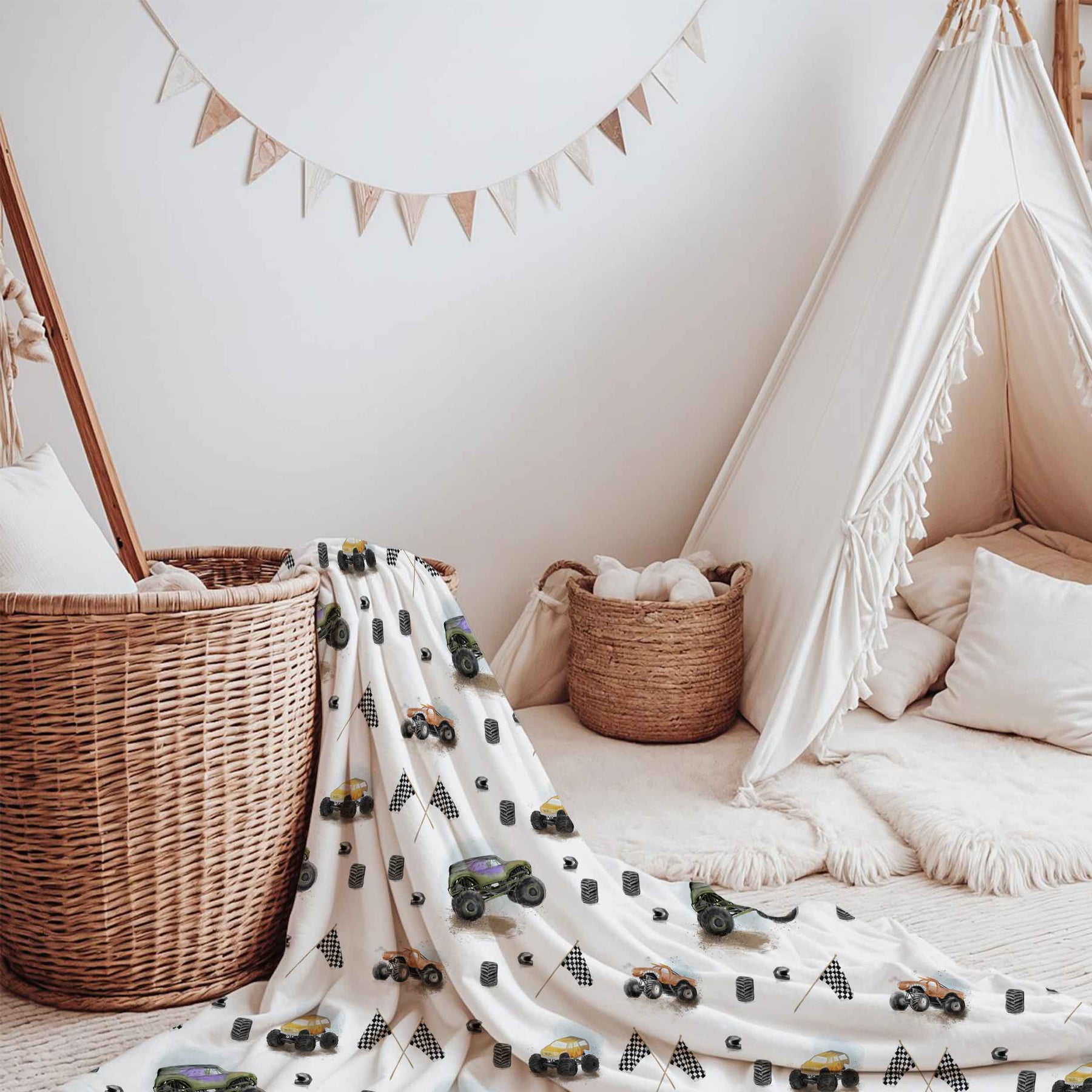 Custom-printed with my vibrant Monster Truck illustrations, the front is rich in detail while the pale gray minky back blends seamlessly into any setting. The soft double layer provides cozy warmth, perfect for reading, naps, or snuggling with family.