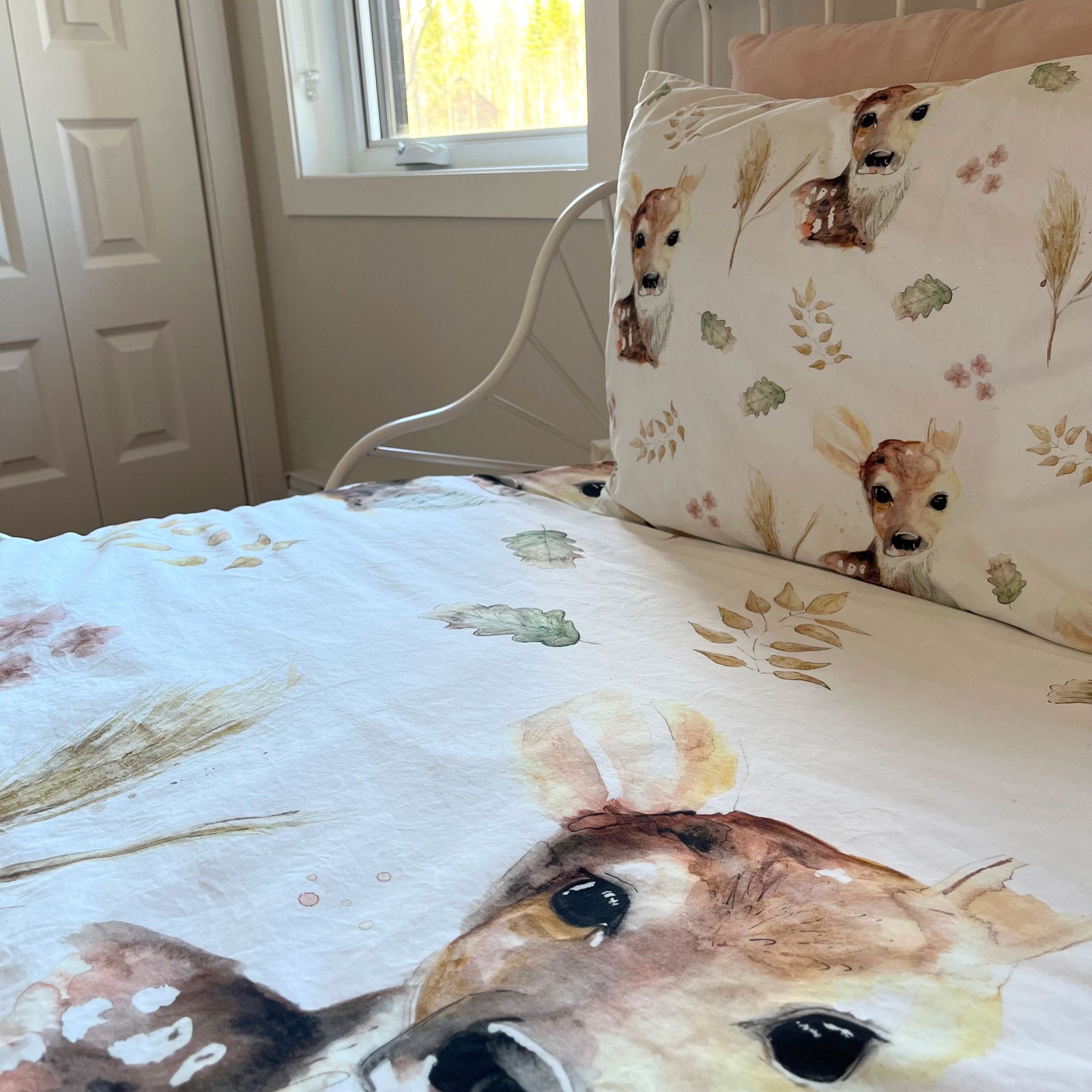 The duvet cover is illustrated with original watercolors by Cynthia Paquette. The fabric is printed with reactive permanent inks. The colors do not wash out in the wash or over use.