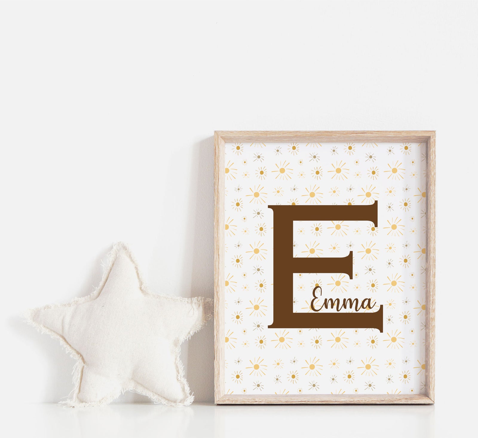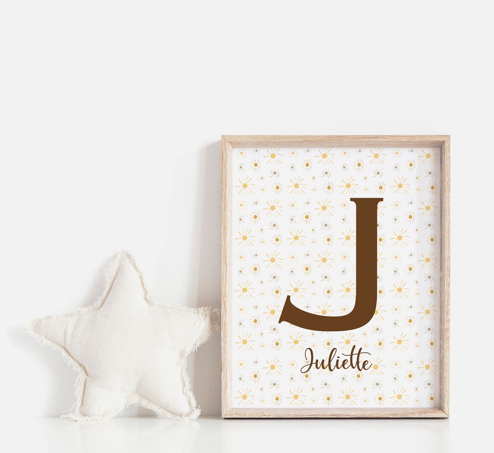 Illumine la chambre de ton enfant avec mon affiche personnalisée prénom! Réalisée sur tablette numérique et imprimée sur du papier de qualité, l'affiche est illustré d'une panoplie de petits soleils qui rappellent le moment magique d'un coucher de soleil. Les tons jaune ocre, cuivre et caramel ajoutent une touche bohème et chaleureuse, parfaite pour créer un nid douillet.