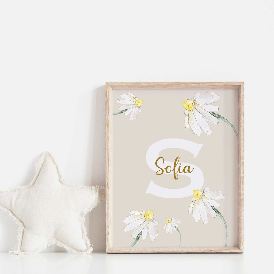 Personnalise l'espace de ton enfant avec mon affiche marguerites! Avec soin, je crée une affiche qui met en avant son initiale et son prénom, entourés de délicates marguerites aquarelles.