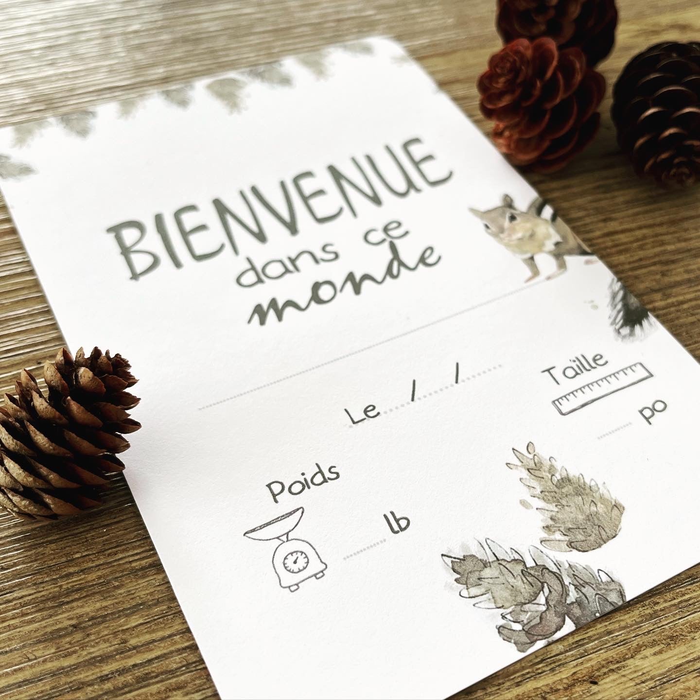 - Bienvenue dans ce monde avec l'espace pour inscrire le prénom de bébé, sa date de naissance, son poids et sa taille.