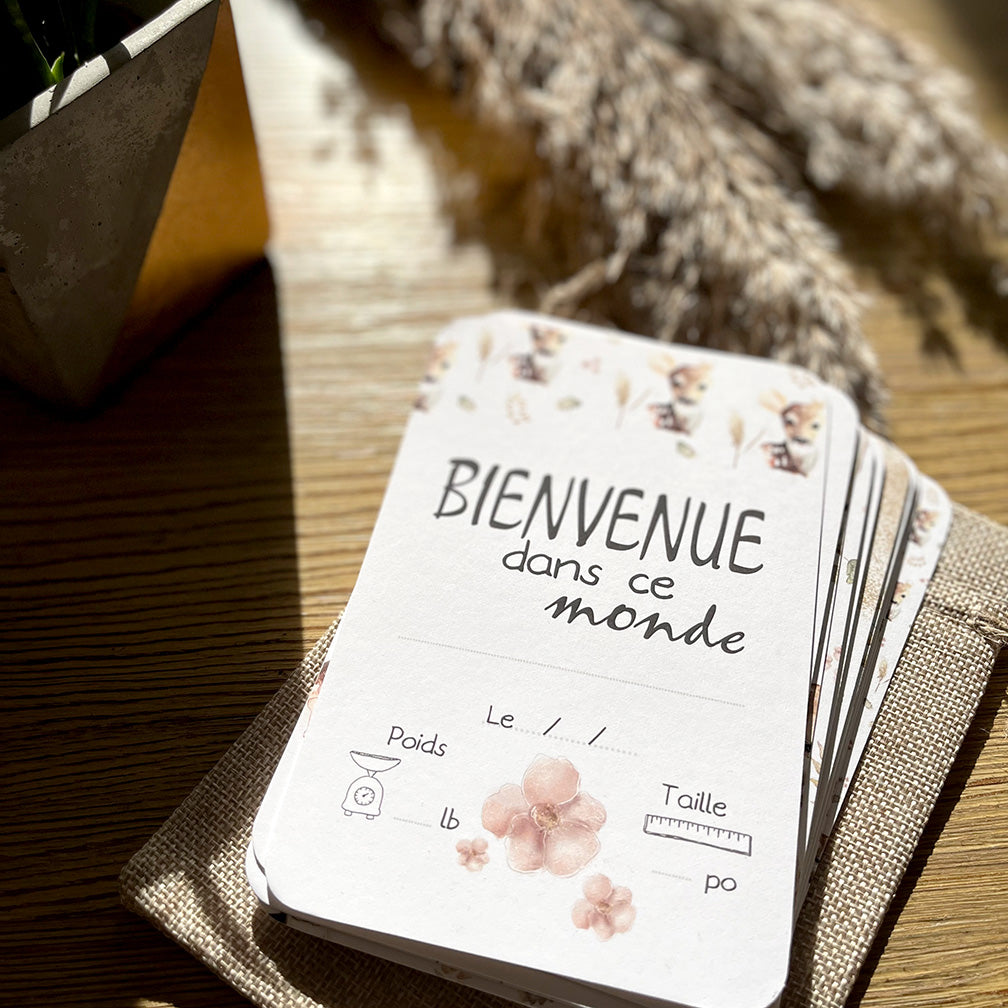 - Bienvenue dans ce monde avec l'espace pour inscrire le prénom de bébé, sa date de naissance, son poids et sa taille.