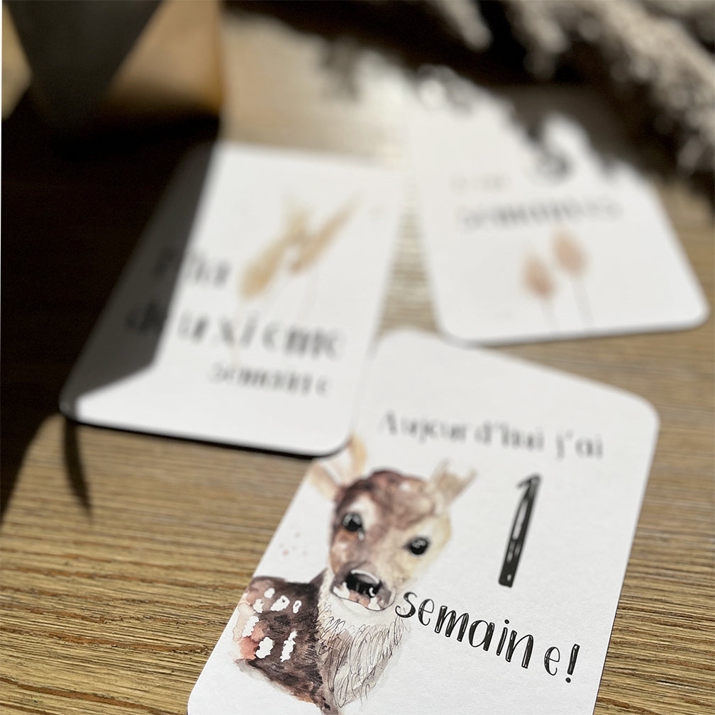 Ensemble de cartons à photographier pour documenter les premiers mois de bébé.