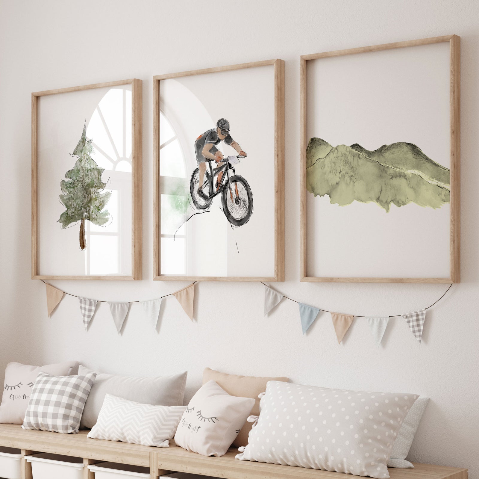 Apporte une touche d'aventure et d'air pur dans la chambre de ton enfant avec cet ensemble d'affiches d'art authentique inspirées par la nature et le vélo de montagne. Qu'il soit déjà passionné de cyclisme ou que tu souhaite simplement éveiller l'esprit d'exploration chez ton ou ta tout-petit-e, cet ensemble est idéal. Il inclut une illustration dynamique et minimaliste d'un cycliste, un majestueux sapin boréal, et une montagne imposante, créant un univers qui invite à l'exploration et aux grandes aventures en plein air.